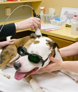 Cold laser therapy is a noninvasive, stress-free and drug-free method used to treat post-surgical pain as well as many acute and chronic conditions including arthritis, joint or muscular pain, wounds, post-operative incision healing, reduction of swelling or edema, allergic dermatitis, lick granulomas, ear infections, and urinary tract disease. The cold laser treats these conditions by improving blood flow to the area, blocking nerve pain fibers, stimulating nerve regeneration, hastening wound healing and reducing bacterial growth.
